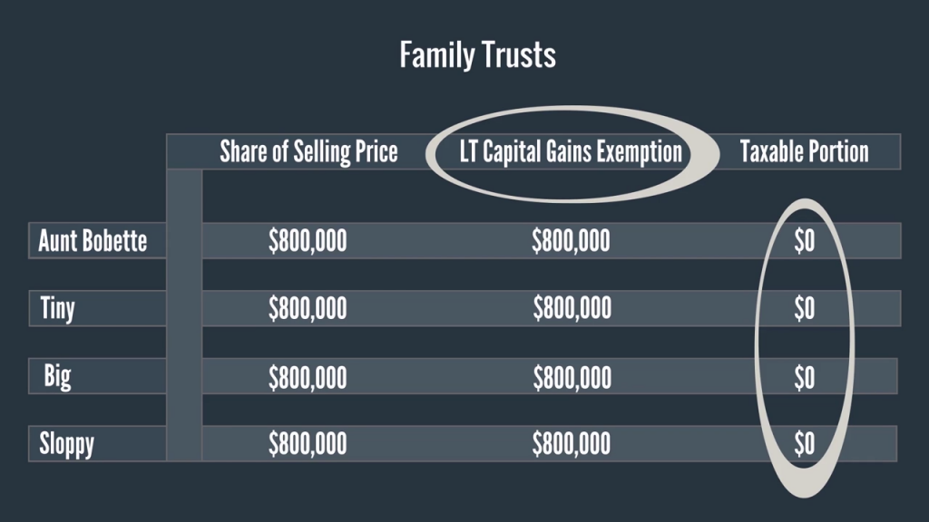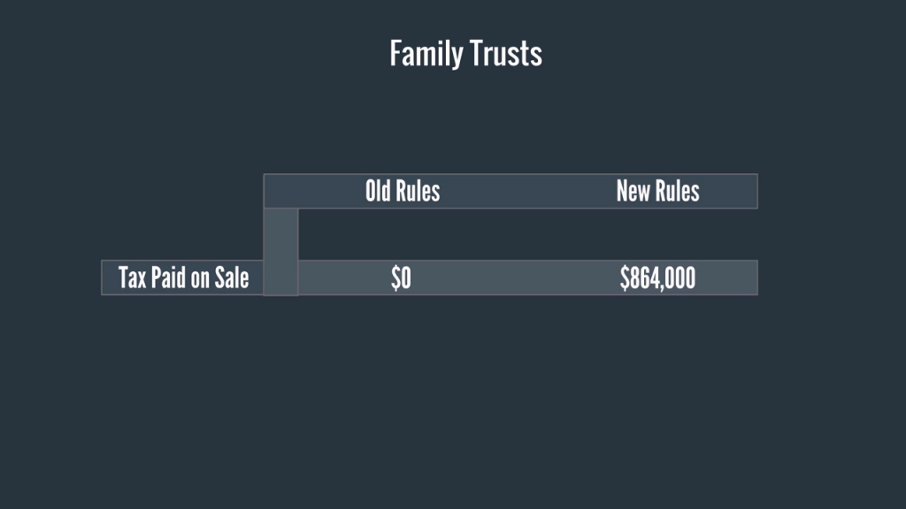 As you can see from the chart, the lifetime capital gains exemption was allowed for each beneficiary and so no tax was paid on the sale. The government has stopped this tax-planning tool under new rules by preventing beneficiaries of a family trust from claiming the lifetime capital gains exemption. If Uncle Bob had sold his company under the new rules, the total tax paid by all of the beneficiaries in respect of the sale would be $864,000.