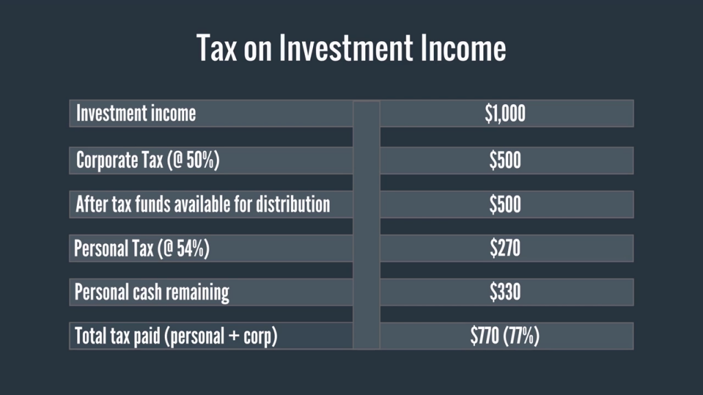 If the proposals are put into law, then the tax rate on investment income earned by a corporation would increase to effectively 50%, without any tax relief. In addition, when the investment income is distributed by the corporation to its shareholders, the shareholders would pay personal tax on the dividends received at a rate of 54%. The combined corporate tax rate and personal tax rate on investment income distributed is approximately 77%.
